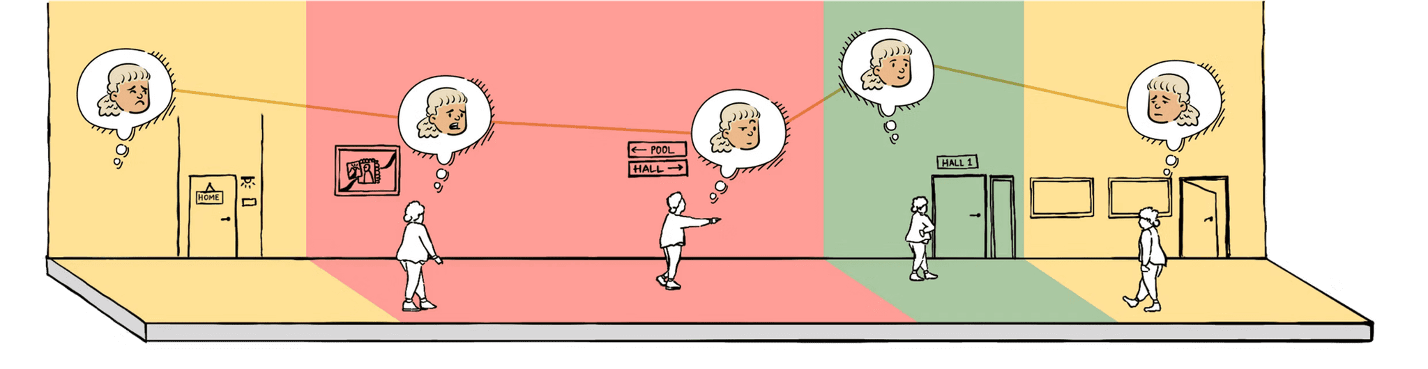 Use consistent thematic elements to make corridors visually engaging and less intimidating.