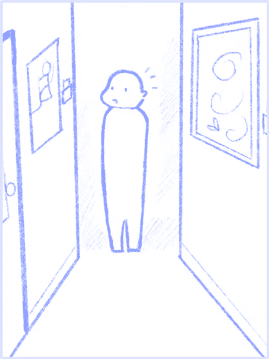 She navigates through multiple identical corridors, struggling to remember turns & landmarks.